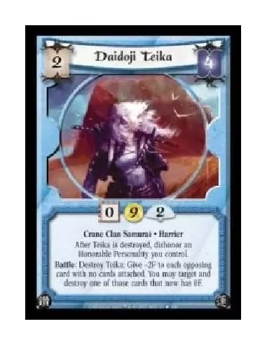 Crane Clan Samurai · Harrier. After Teika is destroyed, dishonor an Honorable Personality you control. Battle: Destroy Teika: Give ?2F to each opposing card with no cards attached. You may target and destroy one of those cards that now has 0F.