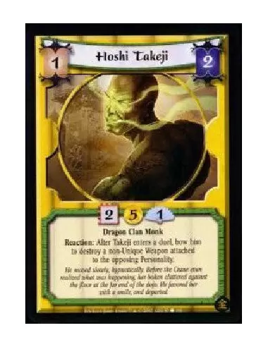 Dragon Clan Monk Reaction: After Takeji enters a duel, bow him to destroy a non-Unique Weapon attached to the opposing Personality. He moved slowly, hypnotically. Before the Crane even realized what was happening, her bokkenclattered against the floor at the far end of the dojo. He favored her with a smile, and departed.