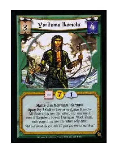 Mantis Clan Mercenary * Samurai Open: Pay 3 Gold to bow or straighten Ikemoto. All players may use this action, and may use it even if Ikemoto is bowed. During an attack phase, each player may use this ability only once.