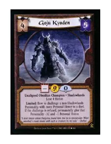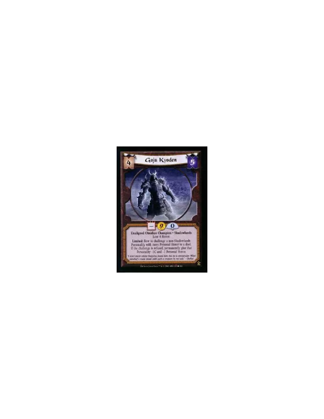 Unaligned Obsidian Champion * Shadowlands * Lose 4 Honor Limited: Bow to challenge a non-Shadowlands Personality with more Personal Honor to a duel. If the challenge is refused, permanently give that Personality -1C and -1 Personal Honor.