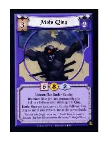 Unicorn Clan Bushi * Cavalry Reaction: Once per turn, permanently give +1F to a Follower after attaching it to Qing. Battle: Once per turn, move a Cavalry Follower from Qing to one of your Personalities in the current battle.