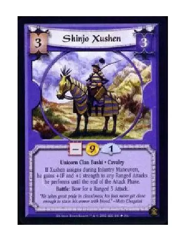 Unicorn Clan Bushi * Cavalry If Xushen assigns during Infantry Maneuvers, he gains +1F and +1 strength to any Ranged Attacks he performs until the end of the Attack Phase. Battle: Bow Xushen for a Ranged 3 Attack.