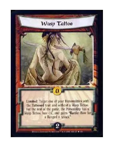 Limited: Target one of your Personalities with the Tattooed trait and without a Wasp Tattoo. For the rest of the game, the Personality has Wasp Tattoo, has -1C, and gains "Battle: Bow for a Ranged 4 Attack."