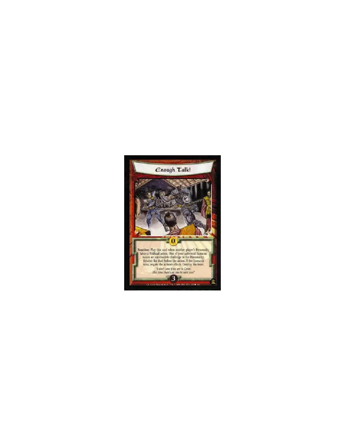Reaction: Before another player's target Personality performs a Political action, target one of your unbowed Samurai Personalities to issue an unrefusable challenge to the other Personality. Resolve the duel before the Political action. If your Samurai wins, negate the Political action's effects.