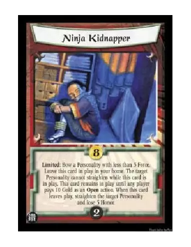 Limited: Bow a Personality with less than 5 Force. Leave this card in play in your home. The target Personality cannot straighten while this card is in play. This card remains in play until any player pays 10 Gold as an Open action. When this card leaves play, straighten the target Personality and lose 5 Honor.
