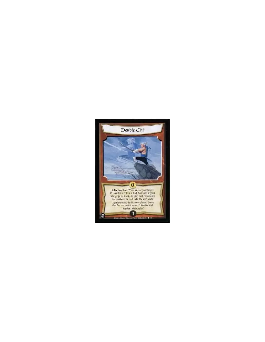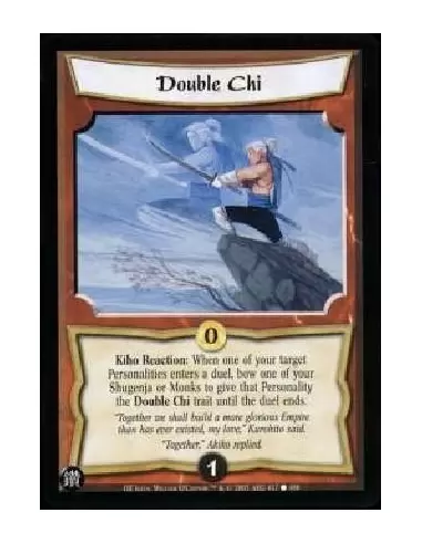 Kiho Reaction: When one of your target Personalities enters a duel, bow one of your Shugenja or Monks to give that Personality the Double Chi trait until the duel ends.