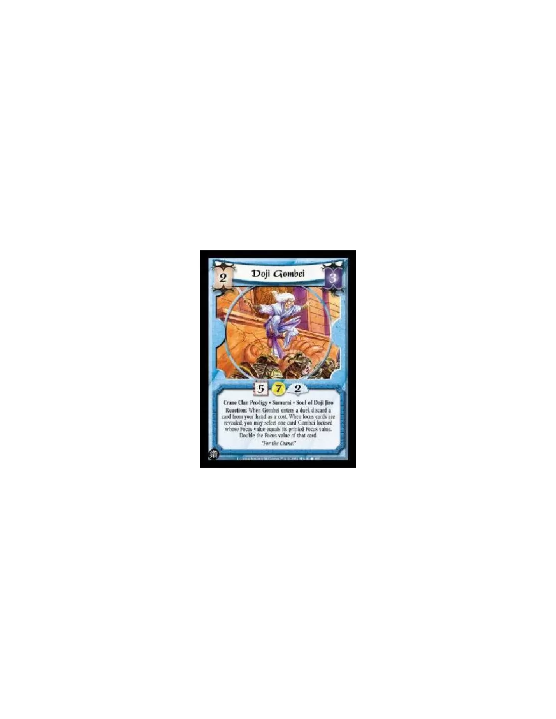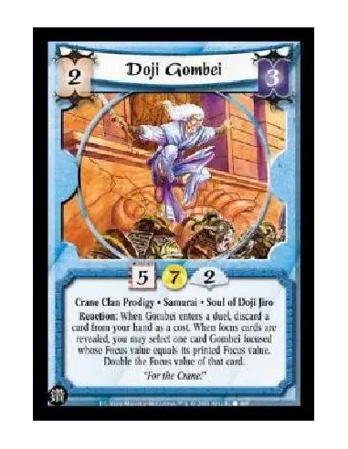 Crane Clan Prodigy * Samurai * Soul of Doji Jiro Reaction: When Gombei enters a duel, discard a card from your hand as a cost. When focus cards are revealed, you may select one card Gombei focused whose Focus value equals its printed Focus value. Double the Focus value of that card.