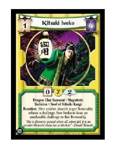 Dragon Clan Samurai . Magistrate Tactician . Soul of Kitsuki Kaagi Reaction: After another player's target Personality refuses a challenge, bow Iweko to issue an unrefusable challenge to that Personality.