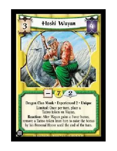 Dragon Clan Monk * Tattooed Experienced 2 * Unique Limited: Once per turn, place a Tattoo token on Wayan. Reaction: After Wayan gains a Force bonus, remove a Tattoo token from him to raise the bonus by his Personal Honor until the end of the turn.