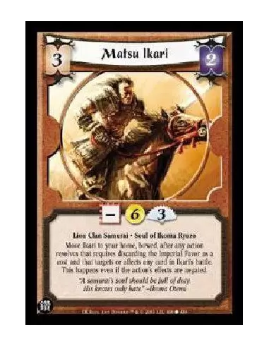 Lion Clan Samurai * Soul of Ikoma Ryozo Move Ikari to your home, bowed, after any action resolves that requires discarding the Imperial Favor as a cost and that targets or affects any card in Ikari's battle. This happens even if the action's effects are negated.