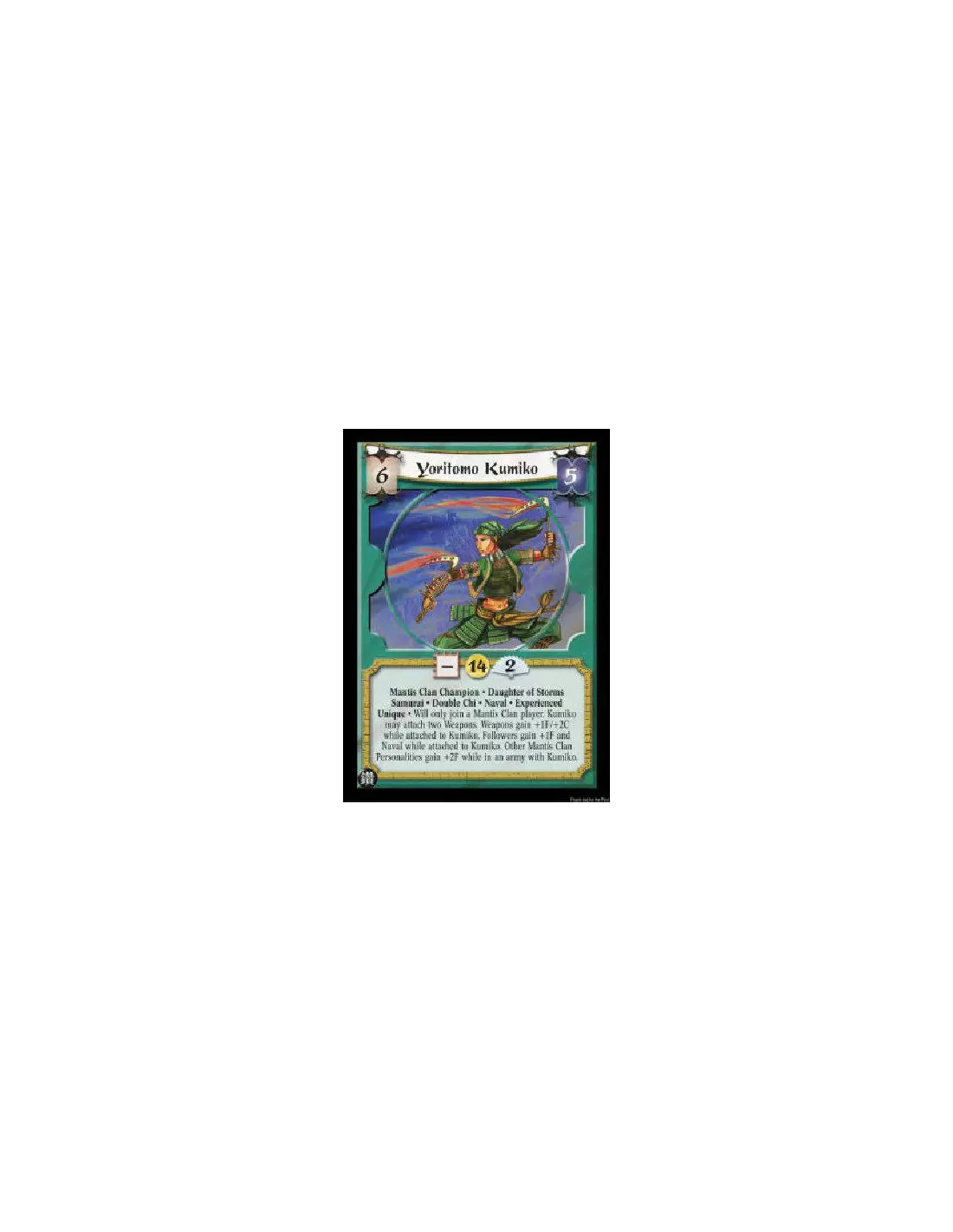 Mantis Clan Champion * Daughter of Storms Samurai * Double Chi * Naval * Experienced Unique * Will only join a Mantis Clan player. Kumiko may attach two Weapons. Weapons gain +1F/+2C while attached to Kumiko. Followers gain +1F and Naval while attached to Kumiko. Other Mantis Clan Personalities gain +2F while in an army with Kumiko.