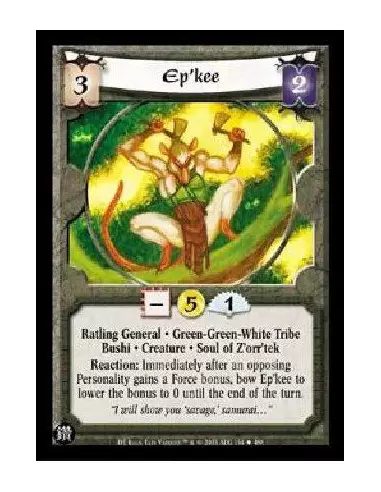 Ratling General * Green-Green-White Tribe Bushi * Creature * Soul of Z'orr'tek Reaction: Immediately after an opposing Personality gains a Force bonus, bow Ep'kee to lower the bonus to 0 until the end of the turn.