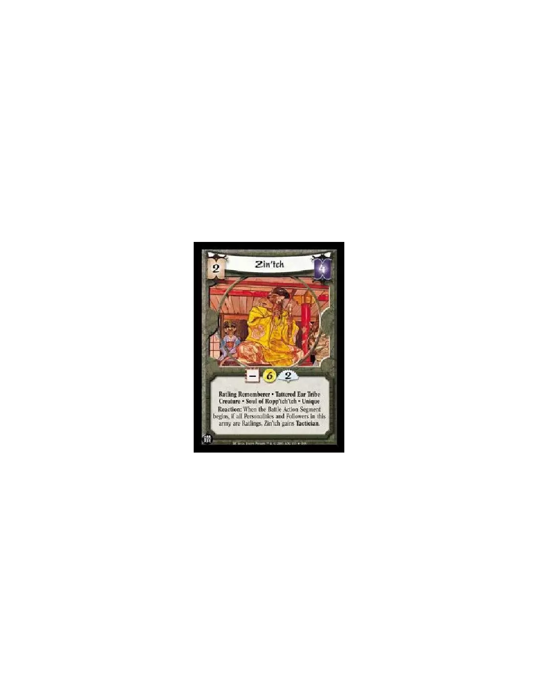 Ratling Rememberer * Tattered Ear Tribe Creature * Soul of Ropp'tch'tch * Unique Reaction: When the Battle Action Segment begins, if all Personalities and Followers in this army are Ratlings, Zin'tch gains Tactician.
