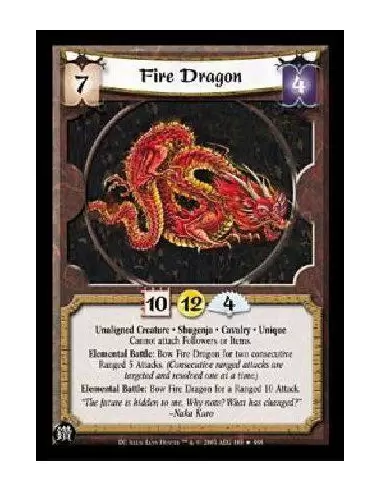 Unaligned Creature * Shugenja * Cavalry * Unique Cannot attach Followers or Items. Elemental Battle: Bow Fire Dragon for two consecutive Ranged 5 Attacks. (Consecutive ranged attacks are targeted and resolved one at a time.) Elemental Battle: Bow Fire Dragon for a Ranged 10 Attack.