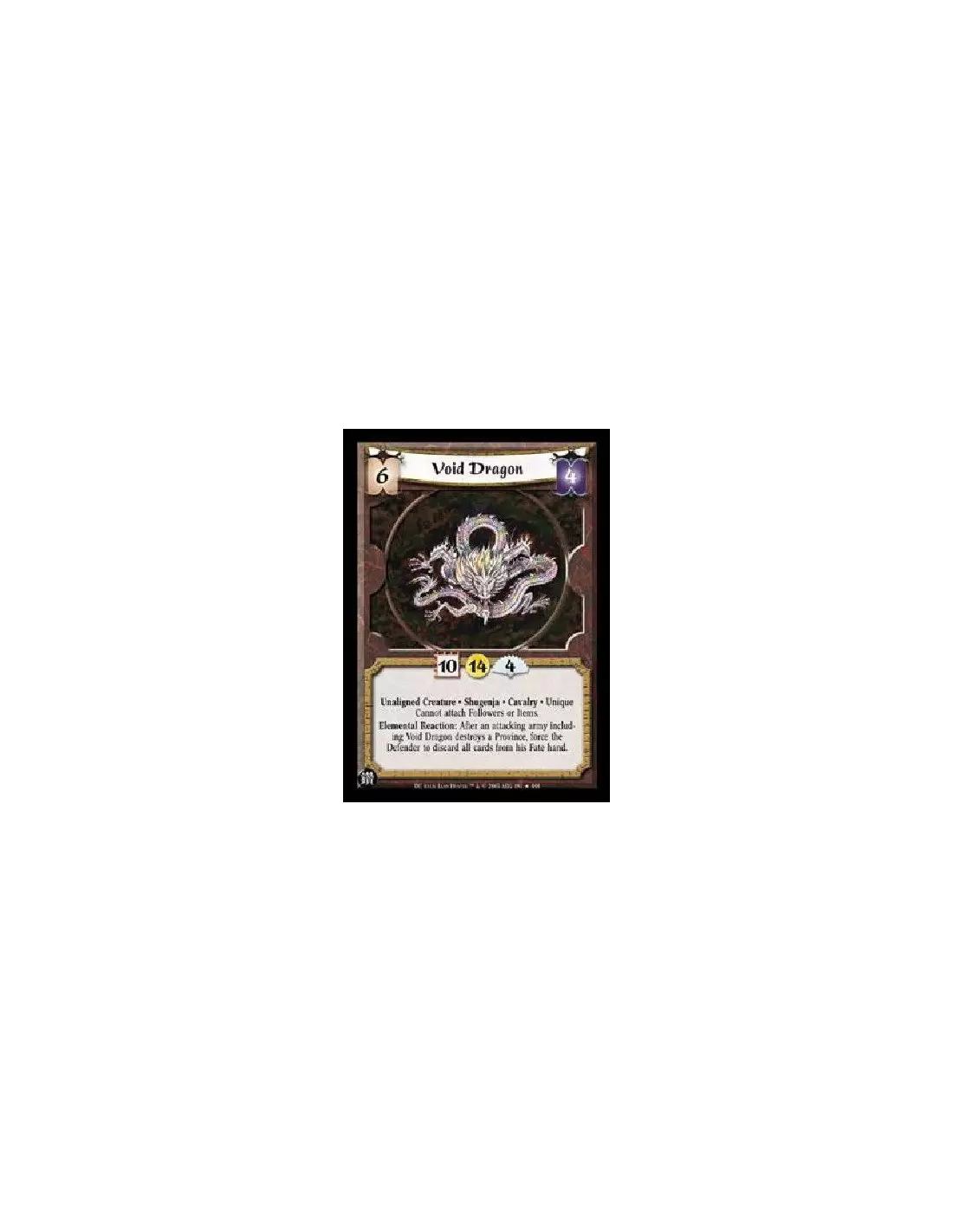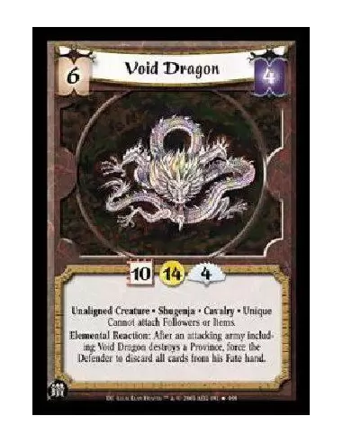 Unaligned Creature * Shugenja * Cavalry * Unique Cannot attach Followers or Items. Elemental Reaction: After an attacking army including Void Dragon destroys a Province, force the Defender to discard all cards from his Fate hand.
