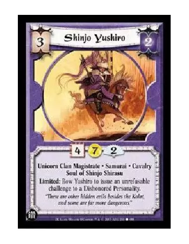 Unicorn Clan Magistrate * Samurai * Cavalry Soul of Shinjo Shirasu Limited: Bow Yushiro to issue an unrefusable challenge to a Dishonored Personality.