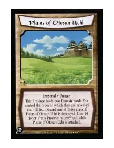 Imperial * Unique This Province holds two Dynasty cards. You control the order in which they are revealed and refilled. Discard one of those cards if Plains of Otosan Uchi is destroyed. Lose 10 Honor if this Province is destroyed while Plains of Otosan Uchi is attached.