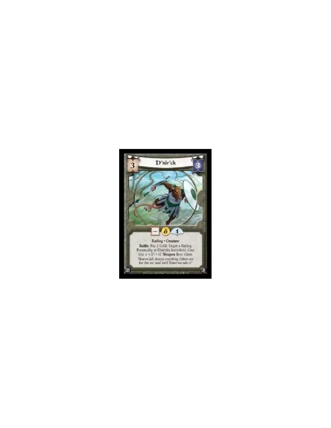 Ratling · Creature. Battle: Pay 2 Gold: Target a Ratling Personality at D'nir'ch's battlefield. Give him a +1F/+1C Weapon Item token