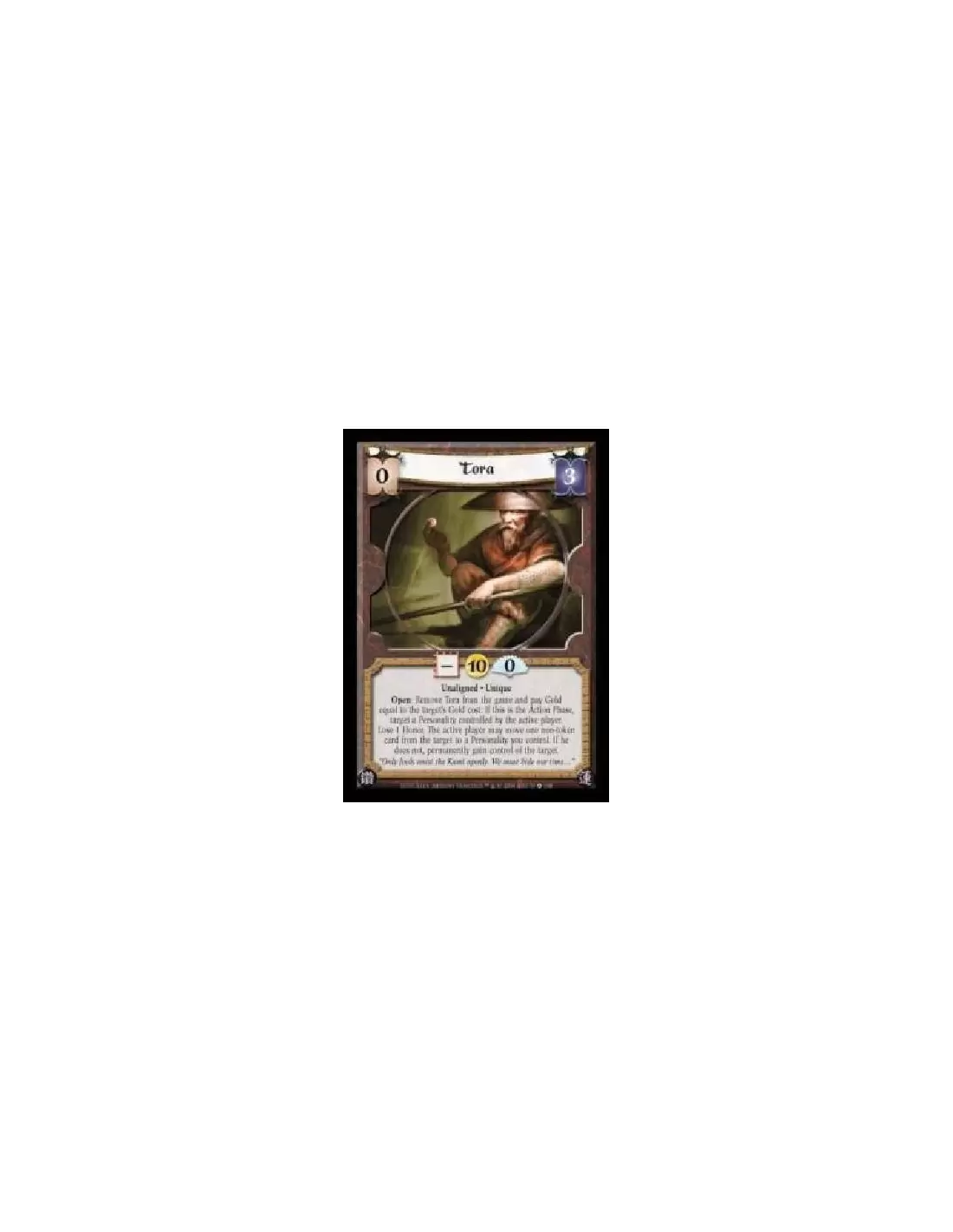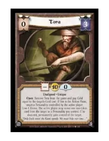 Unaligned · Unique. Open: Remove Tora from the game and pay Gold equal to the target's Gold cost: If this is the Action Phase, target a Personality controlled by the active player. Lose 1 Honor. The active player may move one non-tojen card from the target to a Personality you control. If he does not, permanently gain control of the target.
