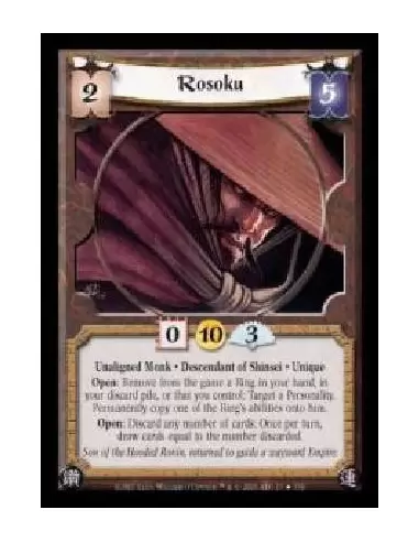 Unaligned Monk · Descendant of Shinsei · Unique. Open: Remove from the game a Ring in your hand, in your discard pile, or that you control: Target a Personality. Permanently copy one of the Ring's abilities onto him. Open: Discard any number of cards: Once per turn, draw cards equal to the number discarded.