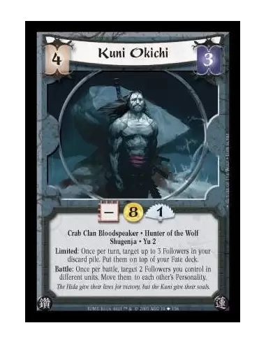 Crab Clan Bloodspeaker · Hunter of the Wolf · Shugenja · Yu 2. Limited: Once per turn, target up to 3 Followers in your discard pile. Put them on top of your Fate deck. Battle: Once per battle, target 2 Followers you control in different units. Move them to each other's Personality.