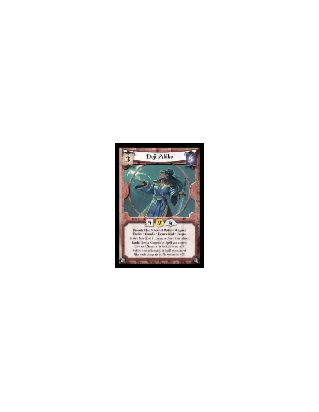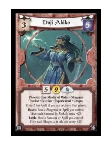 Phoenix Clan Master of Water · Shugenja · Duelist Gozoku · Experienced · Unique. Costs 2 less Gold if you are a Crane Clan player. Battle: Bow a Shugenja or Spell you control: Give each Samurai in Akiko's army +2F. Battle: Bow a Samurai or Spell you control: Give each Shugenja in Akiko's army +2F.