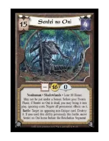 Nonhuman · Shadowlands · Lose 10 Honor. May not be put under a Sensei. Before your Events Phase, if Sentei no Oni is dead, you may bring it into play, ignoring costs. Negate all permanent effects on it. Battle: Target an opposing non-Unique card. Destroy it. If you used this ability previously this battle, move Sentei no Oni home before the Resolution Segment.