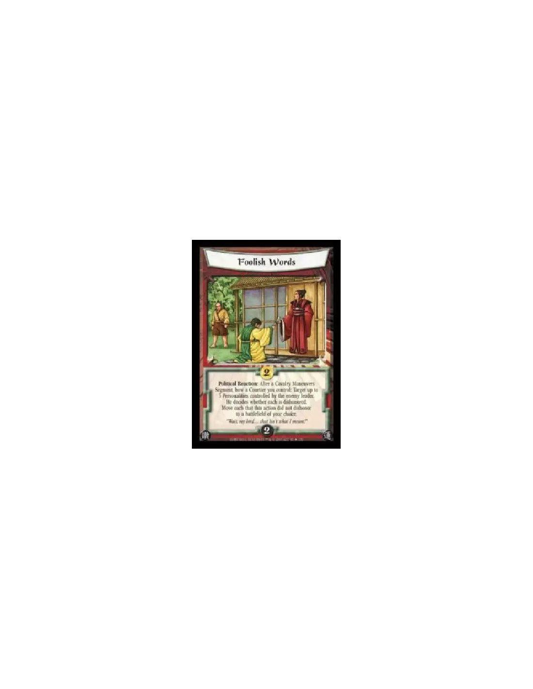 Political Reaction: After a Cavalry Maneuvers Segment, bow a Courtier you control: Target up to 3 Personalities controlled by the enemy leader. He decides whether each is dishonored. Move each that this action did not dishonour to a battlefield of your choice.