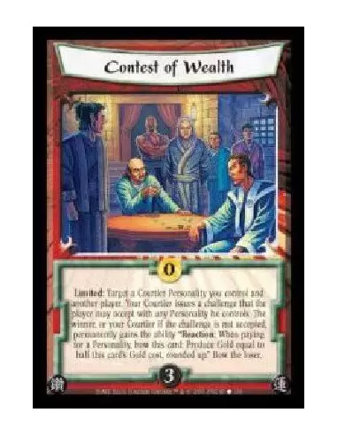 Limited: Target a Courtier Personality you control and another player. Your Courtier issues a challenge that the player may accept with any Personality he controls. The winner, or your Courtier if the challenge is not accepted, permanently gains the ability ?Reaction: When paying for a Personality, bow this card: Produce Gold equal to half this card's Gold cost, rounded up.? Bow the loser.