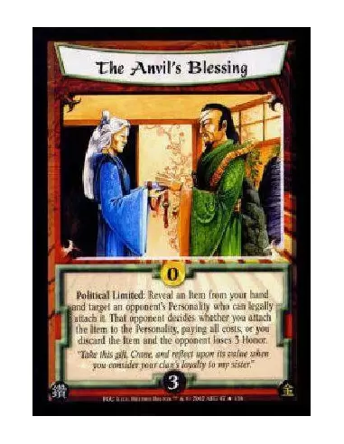 Political Limited: Reveal an Item from your hand and target an opponent's Personality who can legally attach it. That opponent decides whether you attach the Item to the Personality, paying all costs, or you discard the Item and the opponent loses 3 Honor.