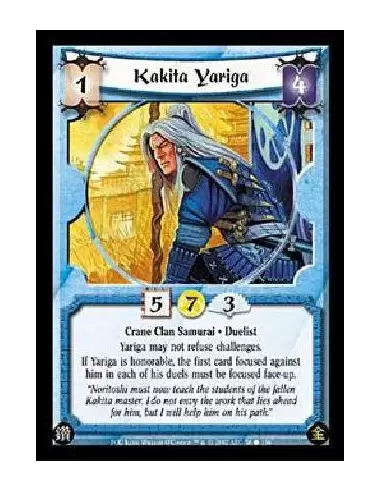 Crane Clan Samurai . Duelist Yariga may not refuse challenges.If Yariga is honorable, the first card focused against him in each of his duels must be focused face-up.