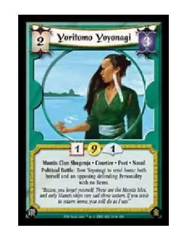 Mantis Clan Shugenja * Courtier * Poet * NavalPolitical Battle: Bow Yoyonagi to send home both herself and an opposing defending Personality with no Items.