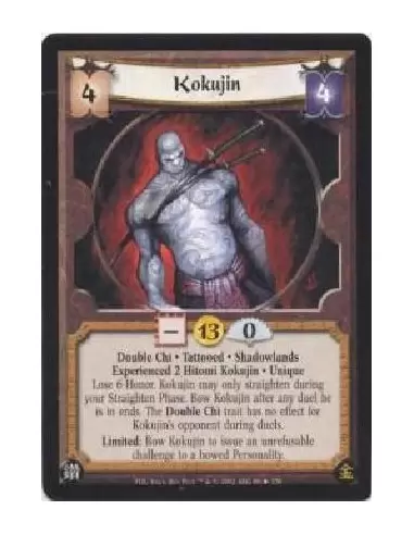 Double Chi . Tattooed . Shadowlands Experienced 2 Hitomi Kokujin . Unique. Lose 6 Honor. Kokujin may only straighten during your Straighten Phase. Bow Kokujin after any duel he is in ends. The Double Chi trait has no effect for Kokujin's opponent during duels. Limited: Bow Kokujin to issue an unrefusable challenge to a bowed Personality.