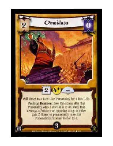 Will attach to a Lion Clan Personality for 1 less Gold.Political Reaction: Bow Omoidasu after this Personality wins a duel or is in an army that destroys a Province or opposing army to either gain 2 Honor or permanently raise this Personality's Personal Honor by 1.