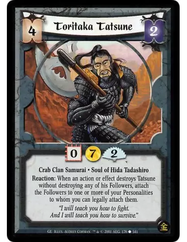 Crab Clan Samurai. Soul of Hida Tadashiro Reaction: When an action or effect destroys Tatsune without destroying any of his Followers, attach the Followers to one or more of your Personalities to whom you can legally attach them.