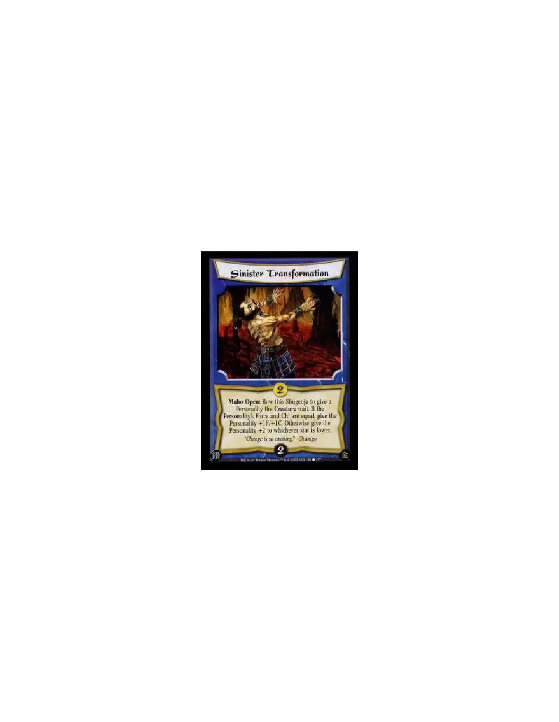 Maho Open: Bow this Shugenja to give a Personality the Creature trait. If the Personality's Force and Chi are equal, give the Personality +1F/+1C. Otherwise give the Personality +2 to whichever stat is lower.