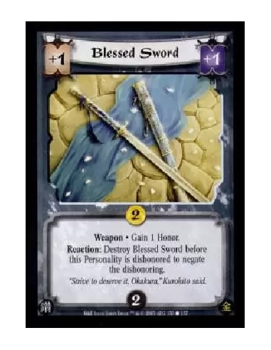 Weapon · Gain 1 Honor.Reaction: Destroy Blessed Sword before this Personality is dishonored to negate the dishonoring.