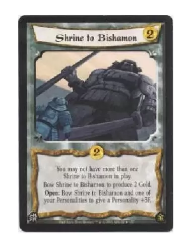 You may not have more than one Shrine to Bishamon in play.Bow Shrine to Bishamon to produce 2 Gold.Open: Bow Shrine to Bishamon and one of your Personalities to give a Personality +3F.