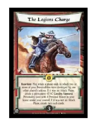 Reaction: Play when a phase ends in which two or more of your Personalities were destroyerd by one other player's actions. If it was an Attack Phase, create a permanent +4F/4C Cavalry Samurai Personality card with 4 Personal Honor in your home under your control. If it was not an Attack Phase, create two such cards.
