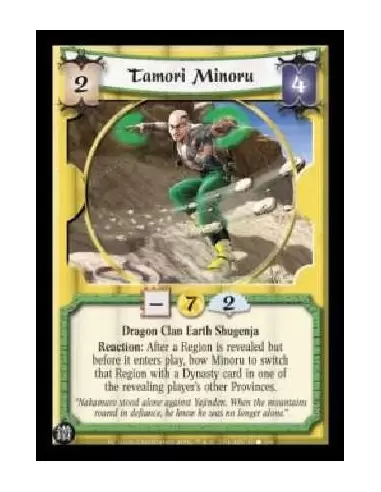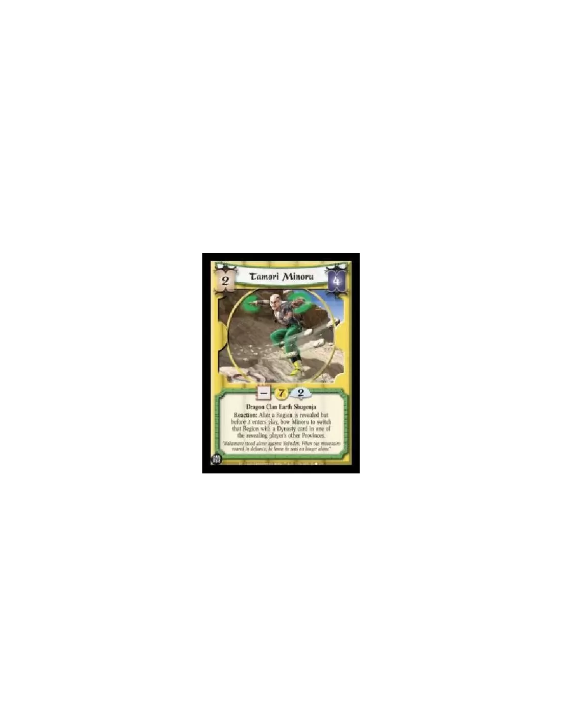 Dragon Clan Earth Shugenja Reaction: After a Region is revealed but before it enters play, bow Minoru to switch that Region with a Dynasty card in one of the revealing players other Provinces.