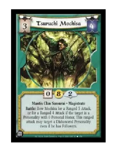 Mantis Clan Samurai . Magistrate Battle: Bow Mochisa for a Ranged 3 Attack, or for a Ranged 4 Attack if the target is a Personality with 0 Personal Honor. This ranged attack may target a Dishonored Personality even if he has Followers.