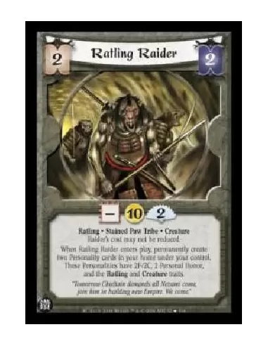 Ratling . Stained Paw Tribe . Creature Raider's cost may not be reduced. When Ratling Raiders enters play, permanently create two Personality cards in your home under your control. These Personalities have 2F/2C, 2 Personal Honor and the Ratling, and Creature traits.