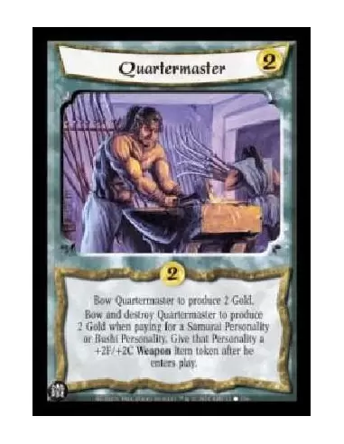 Bow Quartermaster to produce 2 Gold. Bow and destroy Quartermaster to produce 2 Gold when paying for a Samurai Personality or Bushi Personality. Give that Personality a +2F/+2C Weapon Item token after he enters play.