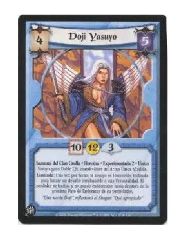 Crane Clan Samurai * Hero * Experinced 2 * Unique Yasuyo gains Double Chi while she has a Unique Weapon attached. Limited: Once per turn, if Yasuyo is Honorable, bow her to challenge a Personality to an unrefusbale duel. The loser bows and may not straighten until after his controller's next Straighten Phase.