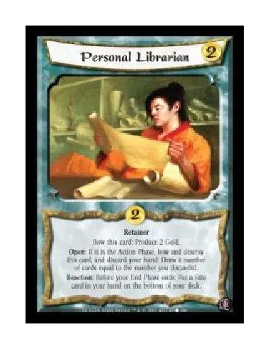 Retainer. Bow this card: Produce 2 Gold. Open: If it is the Action Phase, bow and destroy this card, and discard your hand: Draw a number of cards equal to the number you discarded. Reaction: Before your End Phase ends: Put a Fate card in your hand on the bottom of your deck.