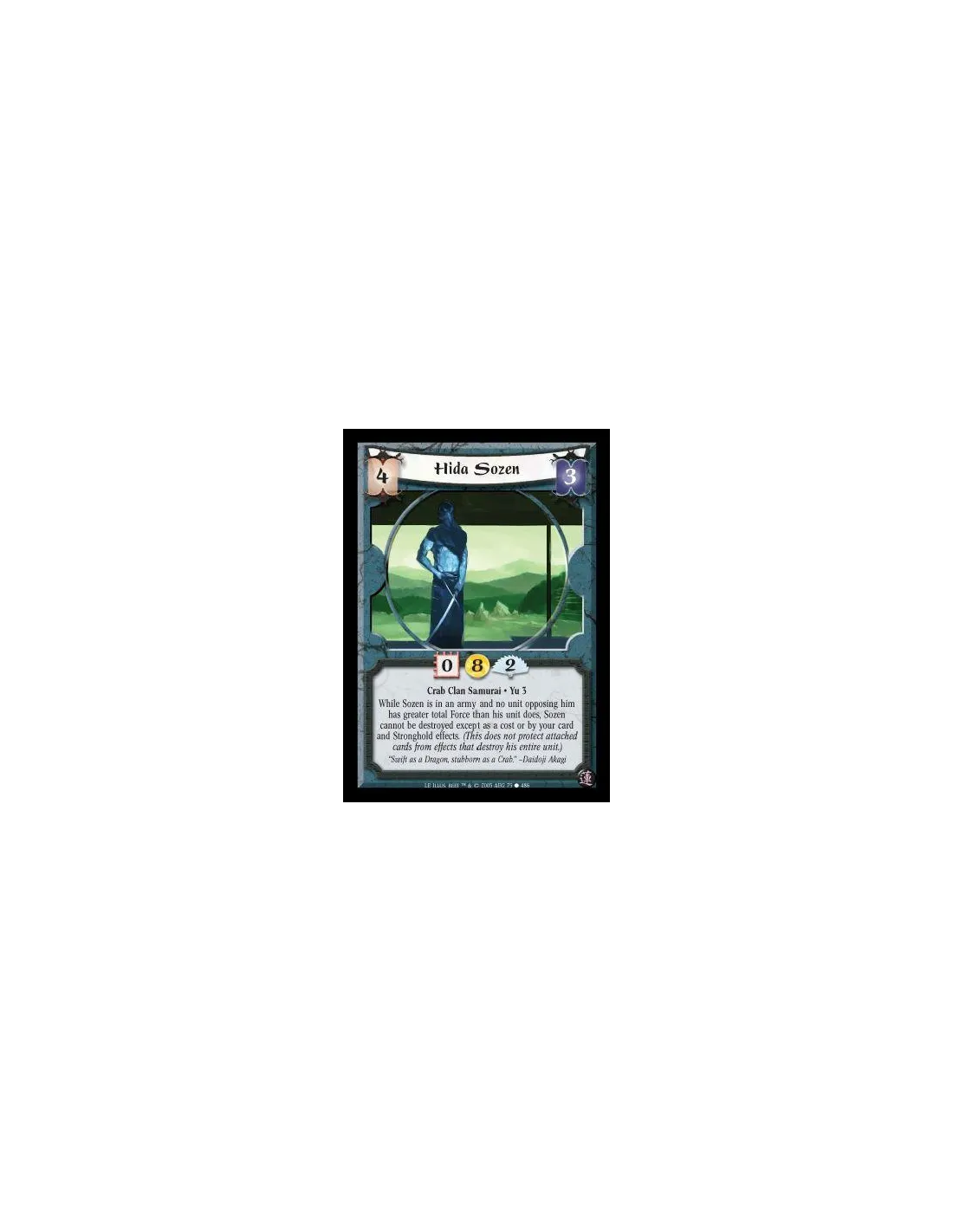 Crab Clan Samurai · Yu 3. While Sozen is in an army and no unit opposing him has greater total Force than his unit does, Sozen cannot be destroyed except as a cost or by your card and Stronghold effects. (This does not protect attached cards from effects that destroy his entire unit.)