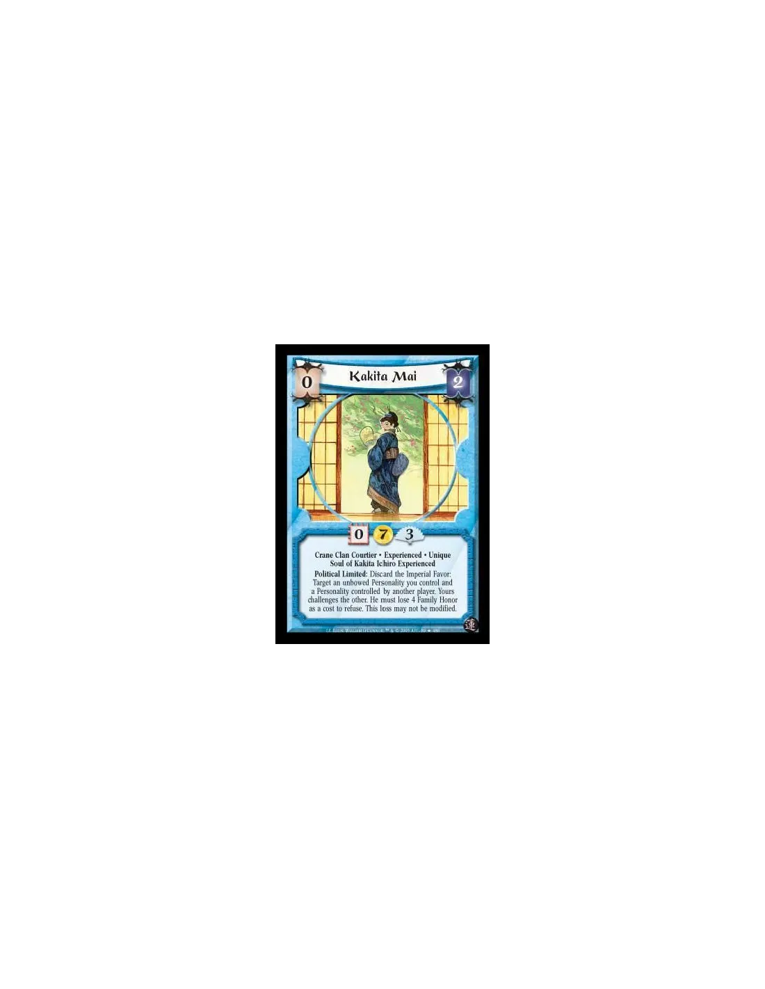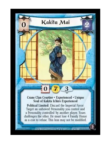 Crane Clan Courtier · Experienced · Unique · Soul of Kakita Ichiro Experienced. Political Limited: Discard the Imperial Favor: Target an unbowed Personality you control and a Personality controlled by another player. Yours challenges the other. He must lose 4 Family Honor as a cost to refuse. This loss may not be modified.
