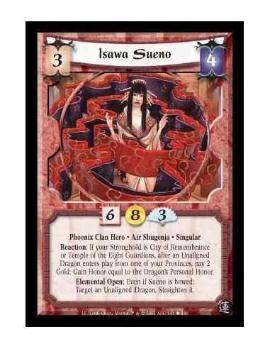 Phoenix Clan Hero · Air Shugenja · Singular. Reaction: If your Stronghold is City of Remembrance or Temple of the Eight Guardians, after an Unaligned Dragon enters play from one of your Provinces, pay 2 Gold: Gain Honor equal to the Dragon's Personal Honor. Elemental Open: Even if Sueno is bowed: Target an Unaligned Dragon. Straighten it