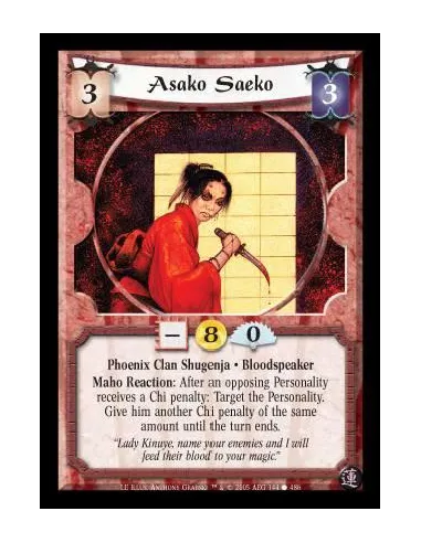 Phoenix Clan Shugenja · Bloodspeaker. Maho Reaction: After an opposing Personality receives a Chi penalty: Target the Personality. Give him another Chi penalty of the same amount until the turn ends