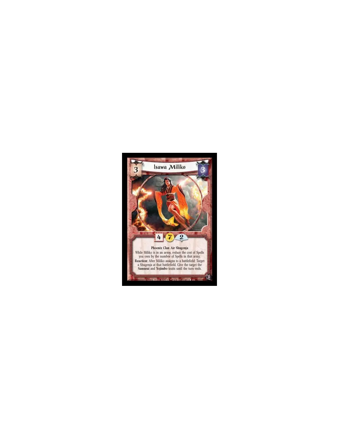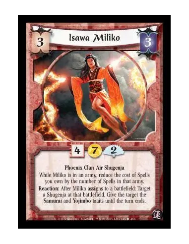 Phoenix Clan Air Shugenja. While Miliko is in an army, reduce the cost of Spells you own by the number of Spells in that army. Reaction: After Miliko assigns to a battlefield: Target a Shugenja at that battlefield. Give the target the Samurai and Yojimbo traits until the turn ends